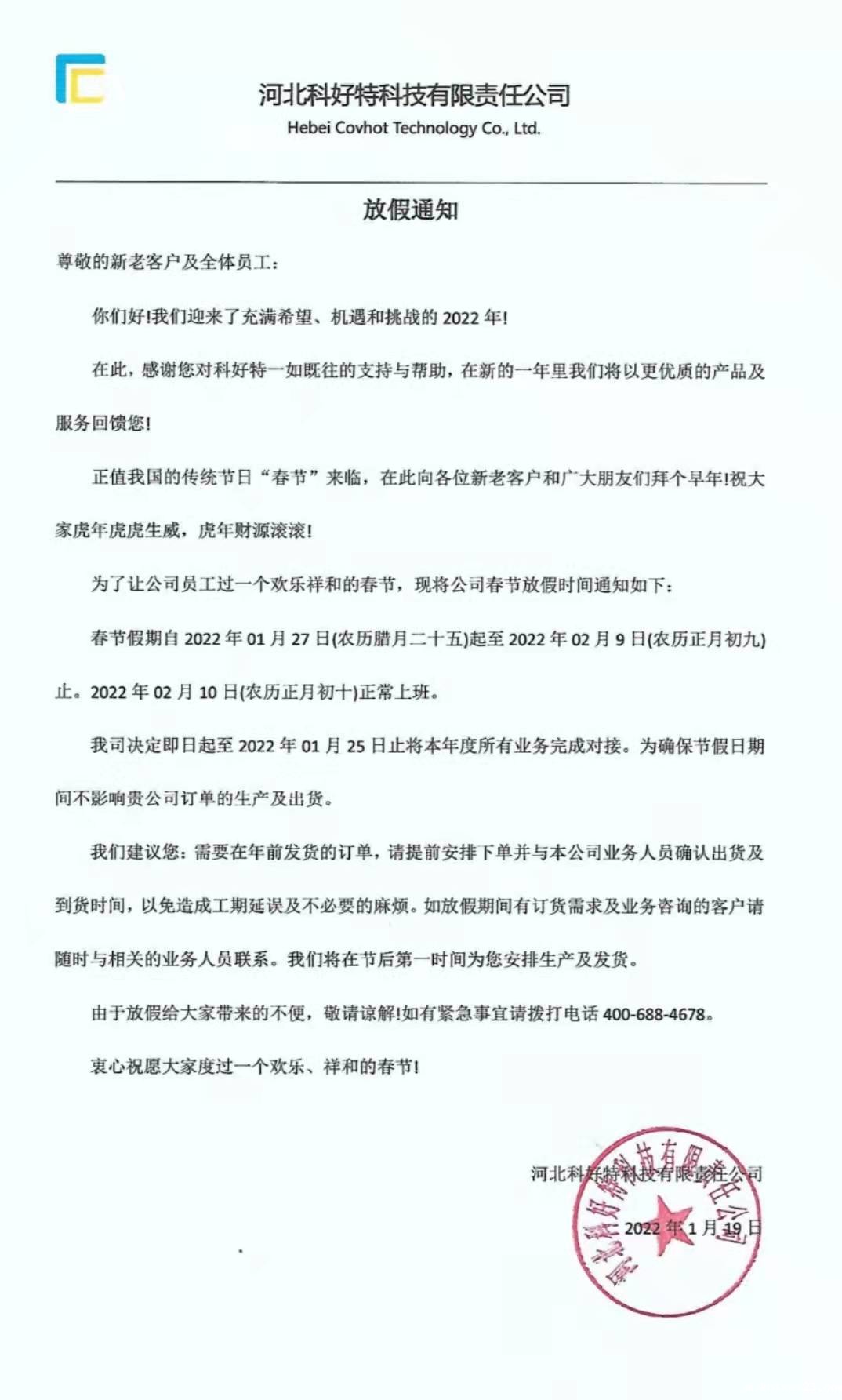 我司决定即日起至2022年01月23日止将本年度所有业务完成对接。为确保节假日期间不影响贵公司订单的生产及出货。