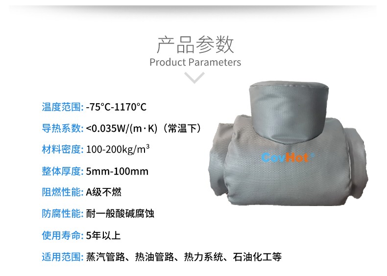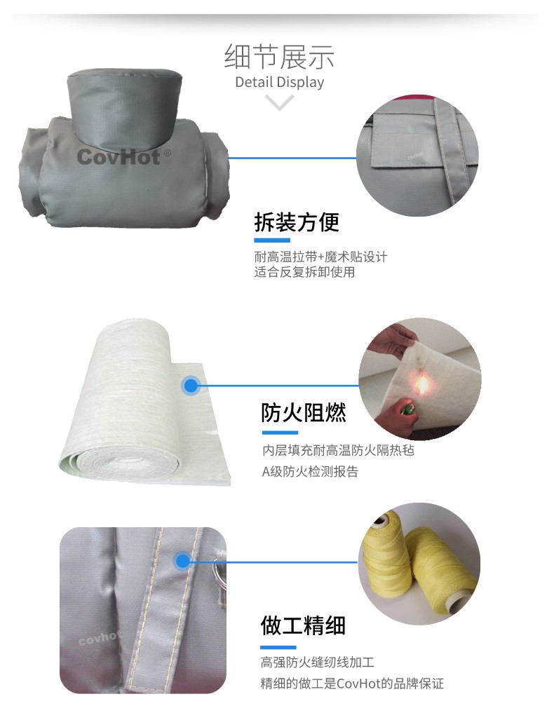 阀门内部介质通常为各种化工原料,柔性可拆卸阀门保温套使用的材料可防火阻燃,能够有效防止因介质泄露引起的火灾 ,另外阀门运行时温度较高,易受热膨胀,“披覆保温”原材料柔韧性较好,能够对阀门的膨胀进行补偿,不会出现保温性能下降现象,有利于阀门机组安全运行,大大提高设备运转率,增加经济效益;