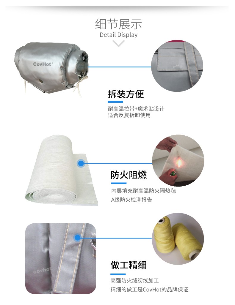 接下来为大家介绍一款非常适合Y型过滤器等异形需频繁检修的设备使用的可拆卸保温套。可拆卸保温套,顾名思义,即可以重复拆卸使用的设备保温套,不仅保温效果显著,而且非常方便拆装,无需专业人员即可在1分钟左右完成拆装,能够为过滤器的检修降低时间投入,从而避免企业由于检修缘故反复做保温这一难题。