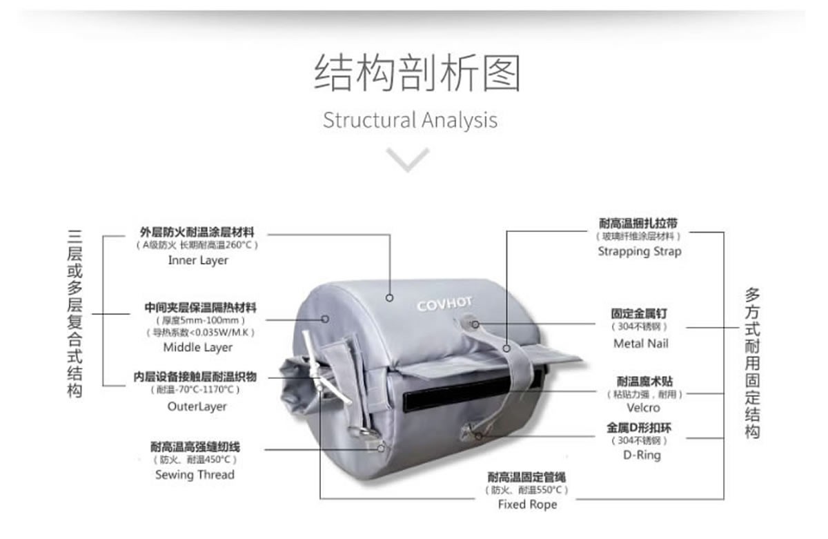 可拆卸式保温衣根据安装位置及温度高低可选择高温绳、高温粘扣、金属扣、拉带等作为固定装置,一般情况下在中低温时可选择粘扣和拉带混合方式进行固定,高温多为拉带,高温绳及金属扣混合方式固定。