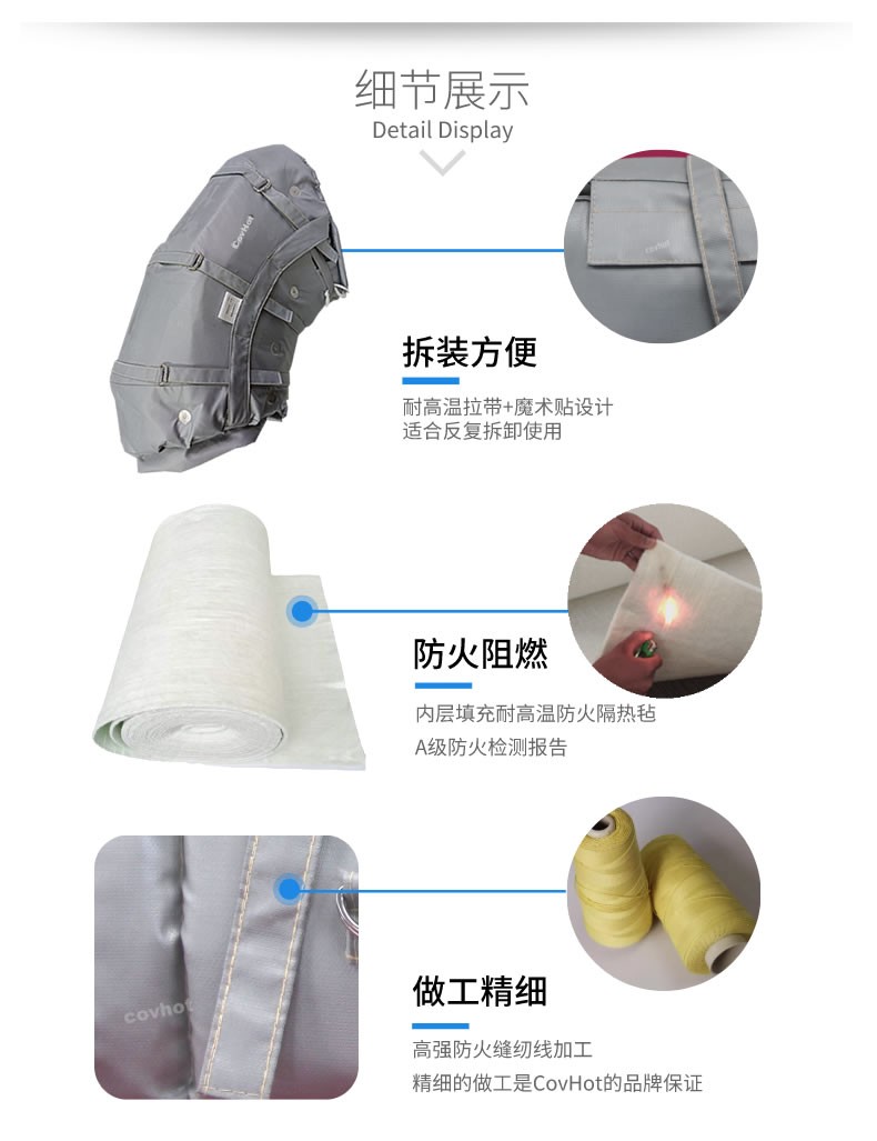 热力/蒸汽管道弯头保温套,也可以叫做热力/蒸汽管道弯头保温衣,热力/蒸汽管道弯头保温罩。管道/弯头可拆卸保温套使用耐高低温、防火保温材料制作而成,拆卸安装方便简单,保温隔热性能高,可使高达500°C的热力/蒸汽管道弯头表面温度降低至50℃以下。