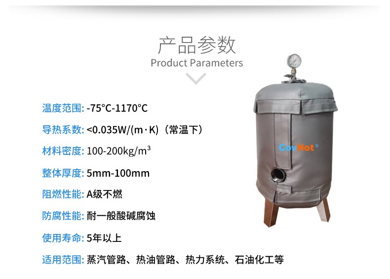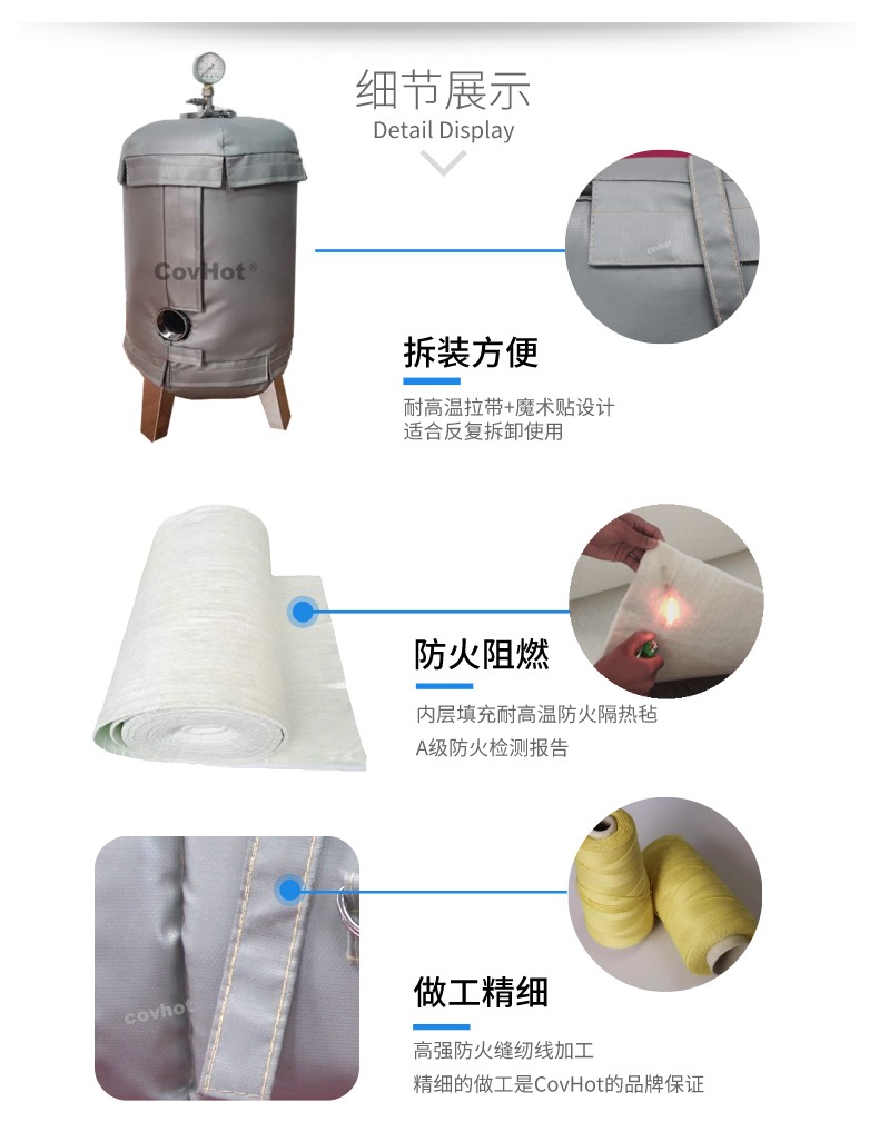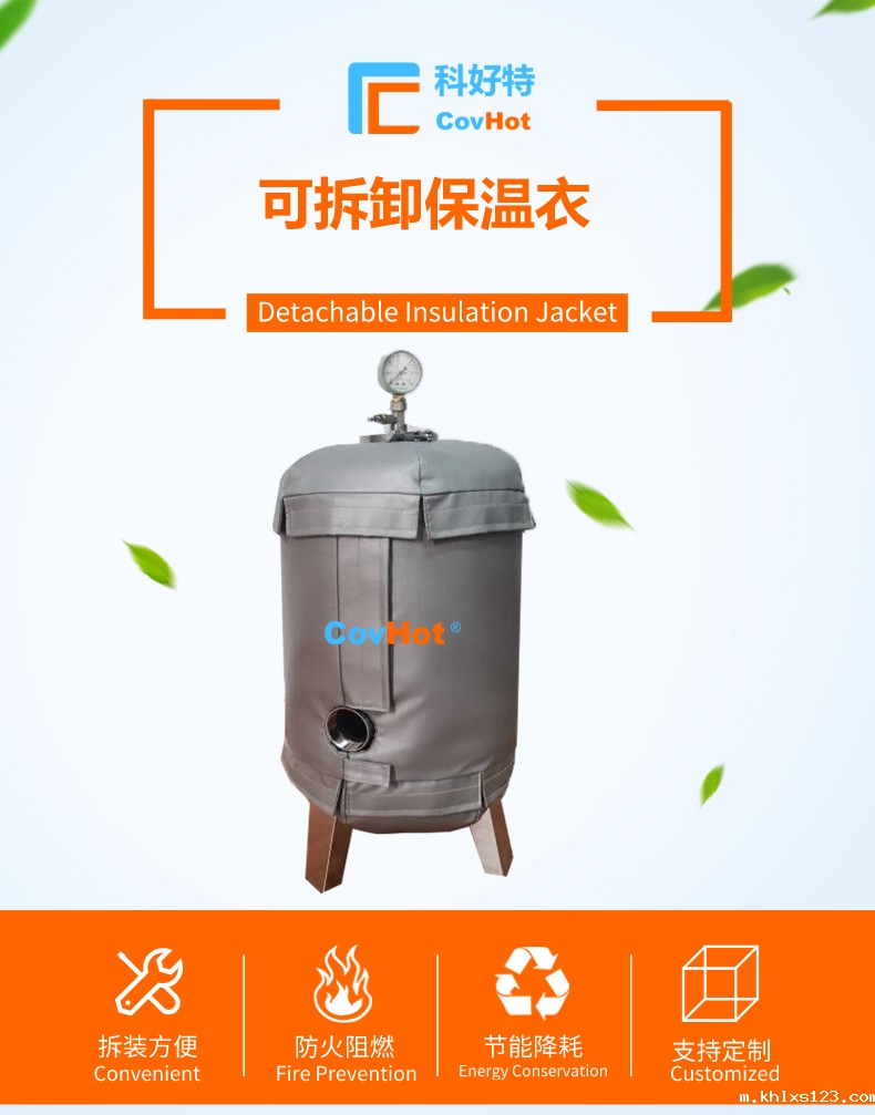 柔性可拆卸保温套根据热力设备外形尺寸量身定制,与设备紧密贴合,整洁美观,保温材料导热系数低,安装拆卸方便。