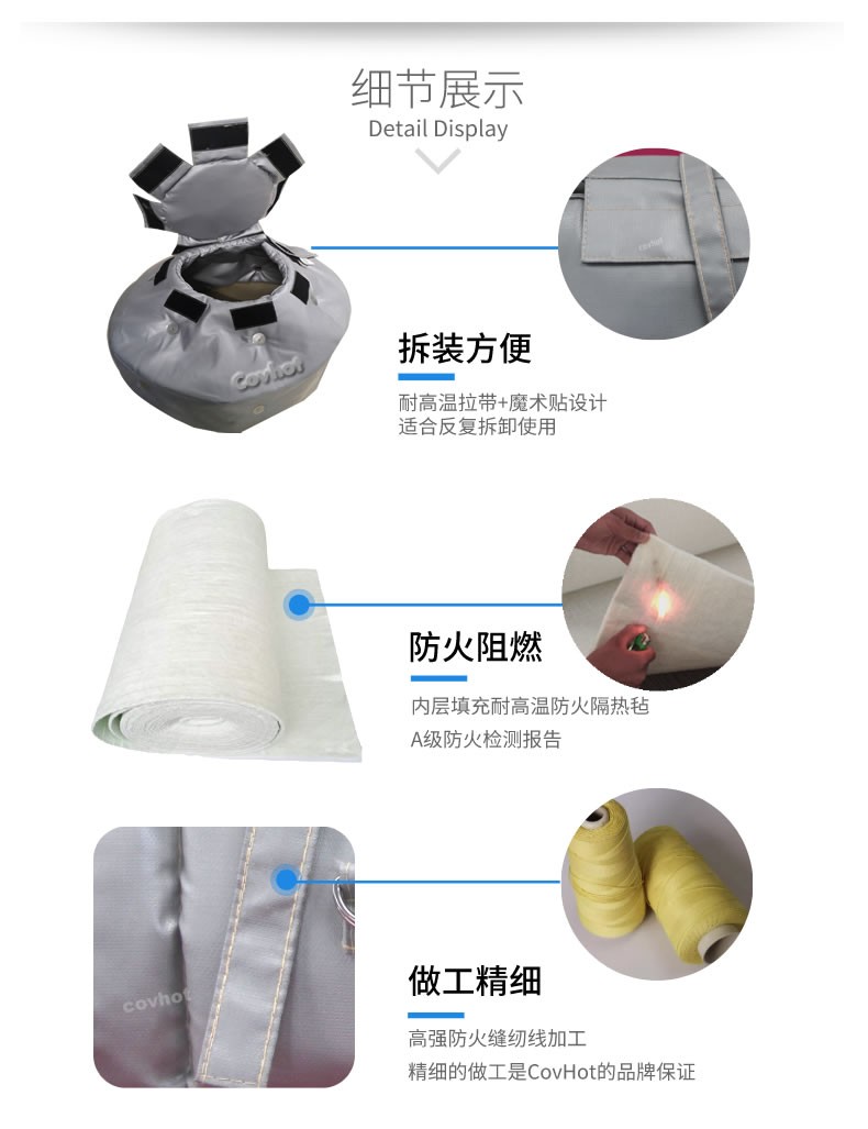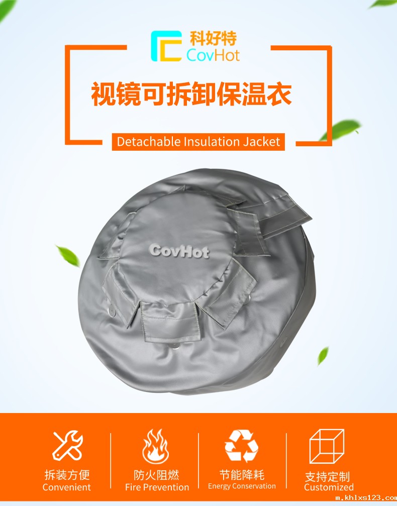 另外,视镜保温隔热套,性能出众,环境适应性强,可以根据被保温设备的使用环境,介质温度等条件选择相应的保温材料,耐温范围广,耐高温可达1000℃以上,低温环境下同样不影响保温套的使用性能。可拆卸保温套具有良好的憎水性能,表面可擦洗,耐各种腐蚀性,特殊定制材料还可以在强酸强碱环境下正常工作。